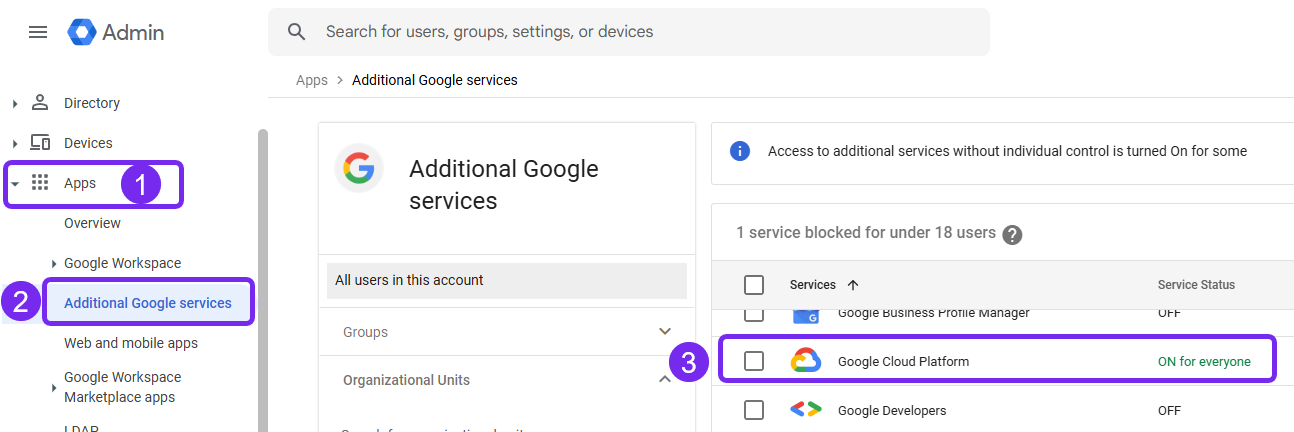 If the service account creation fails, verify that Google Cloud Platform is enabled in your Google Admin Console.