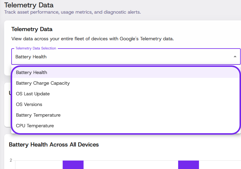 Fleet-wide telemetry reports give you a high-level view of device health and usage across your entire inventory. Requires an active Google Admin Console integration.