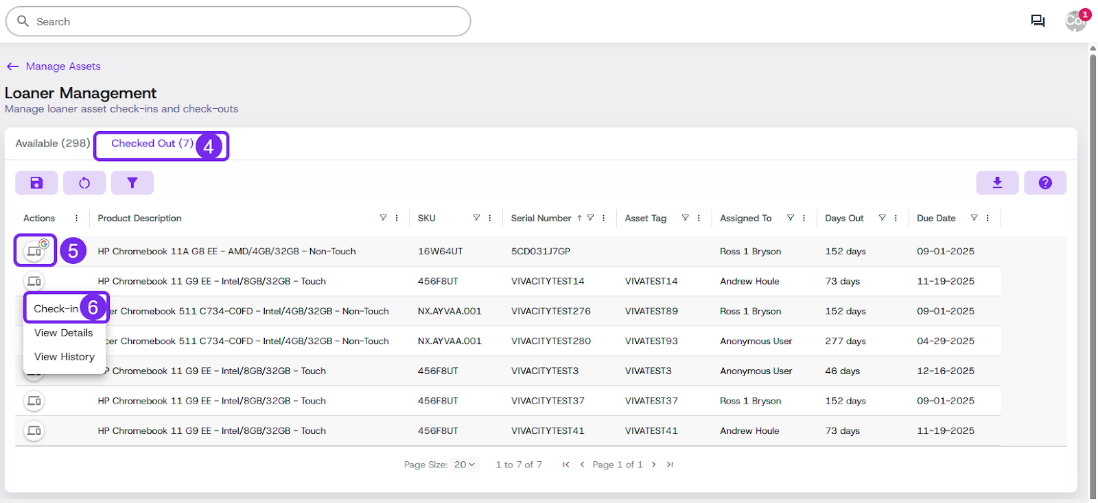 Assets & InventoryLoaner Management Loaner Management — Check InUse this process to check in a loaner device when it is returned. Steps Click Manage, then click Assets Click Loaner Management Click the Checked Out tab Click the Action button on the device being returned, then click Check In Enter the return information Click Submit Updated 2 days ago Loaner Management — Check OutBulk UpdatesAsk AI